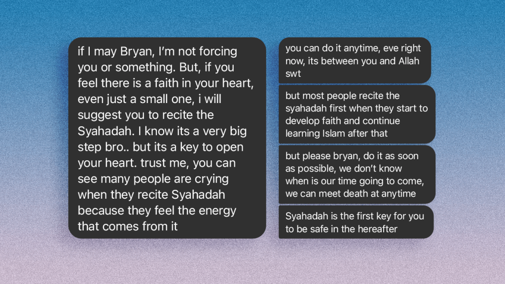 I was overseas, and thought to myself, “it might be a good idea to wait till I come back to Singapore, go to a few more classes, and read up a little more. Or wait and book the official conversion ceremony at Darul Arqam.” This thought was largely unsettling, I looked at my rationale for it and on the surface it seemed, in my limited understanding, sound. However, I could not shake this feeling ever since I received the message. Thoughts overwhelmed me. The fear stemmed from feeling that I already knew Islam is true, and that perhaps the gift of faith already entered my heart and delaying it even for a moment longer was putting my hereafter in dire jeopardy.